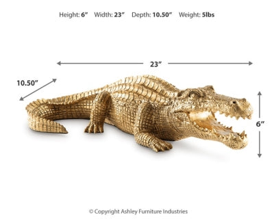 This sculpture brings a glam appeal to wild style. Luxe in an antiqued goldtone finish, the alligator-shaped art piece is a snappy addition to your office or living room decor. Its remarkable attention to detail captures the animal's likeness in decidedly contemporary fashion.